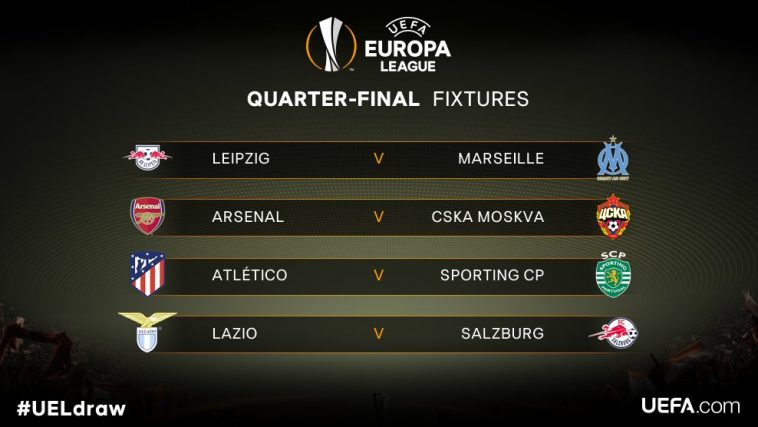 Atlético de Madrid-Sporting Lisboa y Arsenal-CSKA Moscú son los dos enfrentamientos más destacados de los cuartos de final de la Liga Europa, según el sorteo celebrado en la sede de la UEFA en Nyon (Suiza).