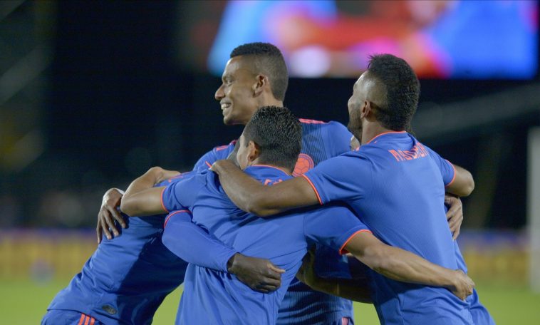 El partido, jugado entre dos escuadras, una de amarillo capitaneada, por Falcao García y otra de azul, liderada por Juan Guillermo Cuadrado, protagonizó un llamado a la línea donde cada uno de los representantes nacionales recibió una salva de aplausos por el público presente.