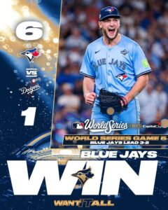 Los Azulejos de Toronto se colocaron a una victoria de su primer título de Serie Mundial en más de tres décadas el miércoles, impulsados por una actuación deslumbrante del lanzador novato Trey Yesavage y un comienzo explosivo al bate para una victoria de 6-1 sobre los Dodgers de Los Ángeles.