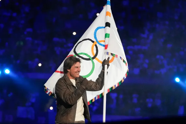 Tom Cruise tuvo una gran entrada. Al igual que sus muchas acrobacias de “Mission Impossible (“Misión Imposible”), Cruise se dejó caer desde lo alto del Stade de France mientras H.E.R. tocaba su guitarra. Condujo una motocicleta entre el público. Y en una secuencia pregrabada, pasó a toda velocidad por París antes de subirse a un avión para lanzarse en paracaídas en tierra californiana.