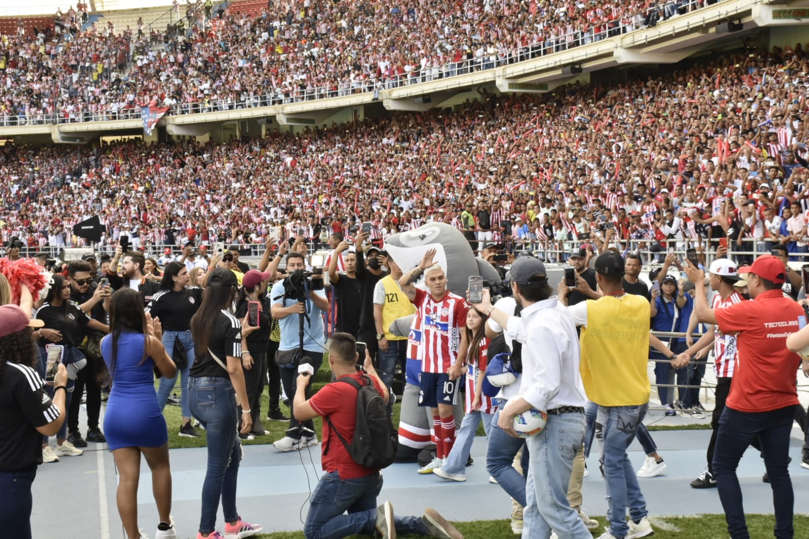 El jugador llegó al recinto en compañía de su representante Rodrigo Riep y del accionista del Junior, Fuad Char, quien le entregó la camiseta marcada con el número 10.