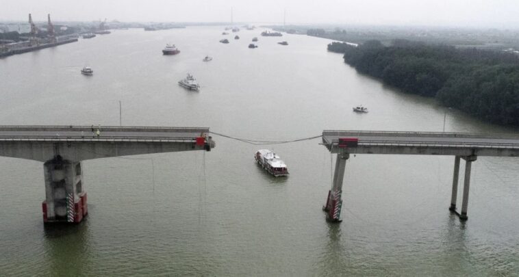 Tres camiones pequeños, un minibús y una moto cayeron del puente ubicado al sur de la ciudad de Guangzhou alrededor de las 5:30 horas, según las autoridades. El minibús, la motocicleta y uno de los camiones cayeron sobre la embarcación y los otros dos vehículos se precipitaron al agua.