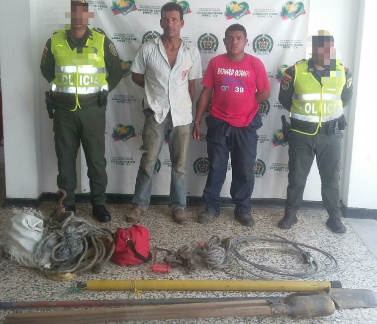 La oportuna intervención de la Policía Nacional permitió capturar a dos personas cuando manipulaban redes eléctricas en zona rural del municipio de Santa Lucía, en el sur del Atlántico.