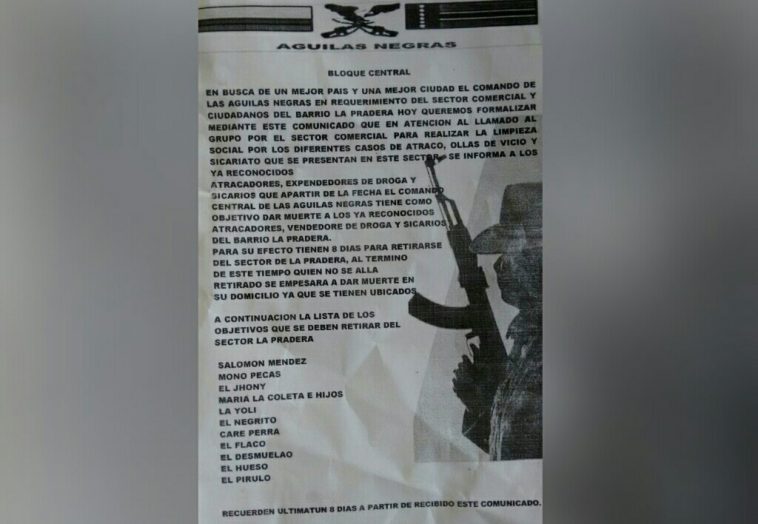 Preocupación ha causado entre los habitantes del barrio La Pradera de Barranquilla, la circulación de un panfleto amenazante a nombre de un supuesto grupo de Las Águilas Negras.