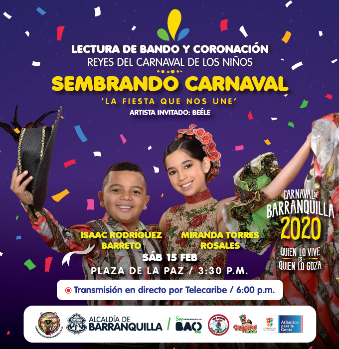 Este fin de semana el Carnaval de Barranquilla dedica sus principales eventos a los niños, con dos días creados especialmente para ellos. El sábado 15 de febrero desde las 3:30 pm la Plaza de la Paz será el escenario para la coronación de los Reyecitos del Carnaval 2020, Miranda Torres Rosales e Isaac Rodríguez Barreto, en una tarde de talento musical, gran espectáculo de baile y la participación del artista revelación más importante del país, Beéle.
