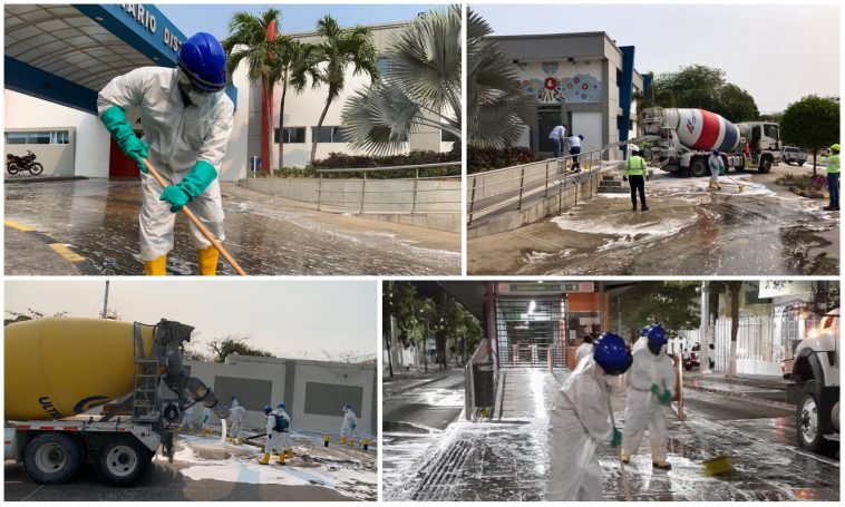 Como parte de la estrategia de la Alcaldía de Barranquilla ante la pandemia por coronavirus Covid-19, varias dependencias coordinadas por la Agencia Distrital de Infraestructura-ADI- y la empresa privada unieron esfuerzos en una jornada de lavado y desinfección de diferentes áreas públicas de la ciudad, con apoyo especial de la Triple A, la Secretaría de Gobierno con el Cuerpo Oficial de Bomberos, y el sector privado a través de Cemex y Ultracem.