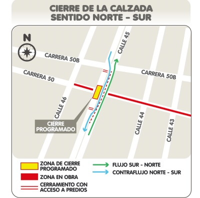 La Secretaría de Movilidad informa a la ciudadanía que a partir del miércoles 18 de mayo, se realizará el cierre de la calzada norte-sur de la Calle 45 (Murillo) sobre la Carrera 50, debido al avance de las obras del Par Vial de la Carrera 50.