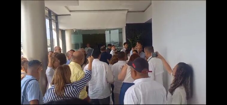 Ya casi al finalizar este evento protocolario, los educadores se hicieron sentir en el piso 12 de la Gobernación gritando arengas a favor de Dagoberto Barraza.
