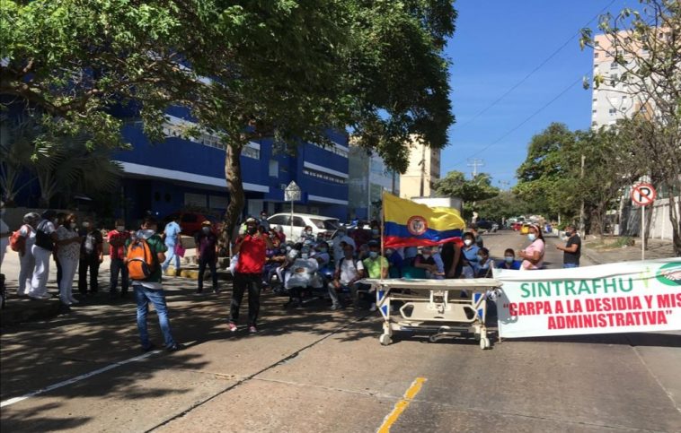 Exhibiendo una deteriorada camilla como símbolo del abandono decenas de trabajadores del hospital metropolitano en el norte de Barranquilla adelantan una jornada de protesta con bloqueo de la carrera 42 H con calle 75 B .