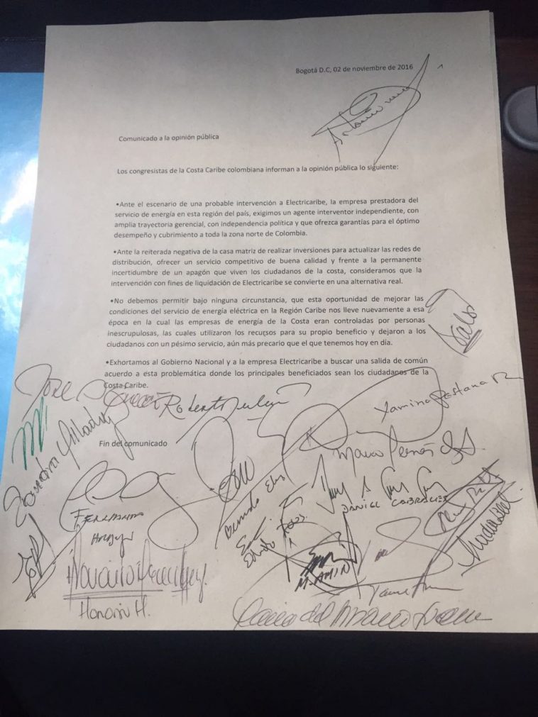 Ante los problemas y la posible intervención de la empresa Electricaribe, los congresistas de la región expresaron su opinión mediante un comunicado donde le piden al Gobierno Nacional y a Electricaribe buscar una salida de “común acuerdo a esta problemática” que afecta a miles de usuarios.