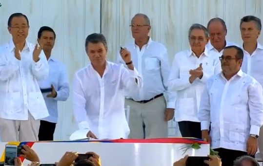 El Jefe del Estado suscribió el texto del Acuerdo Final en compañía del jefe de las Farc, Rodrigo Londoño Echeverri, conocido como ‘Timoleón Jiménez’, y del Secretario General de la Organización de las Naciones Unidas, Ban Ki-moon, en presencia de mandatarios, cancilleres, directores de organismos multilaterales y enviados de todo el mundo.