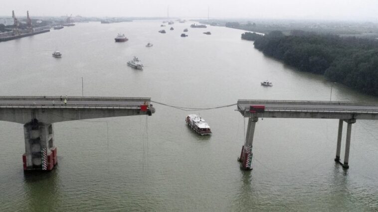 Buque portacontenedores golpea puente en China y causa 5 muertos y derrumbe parcial