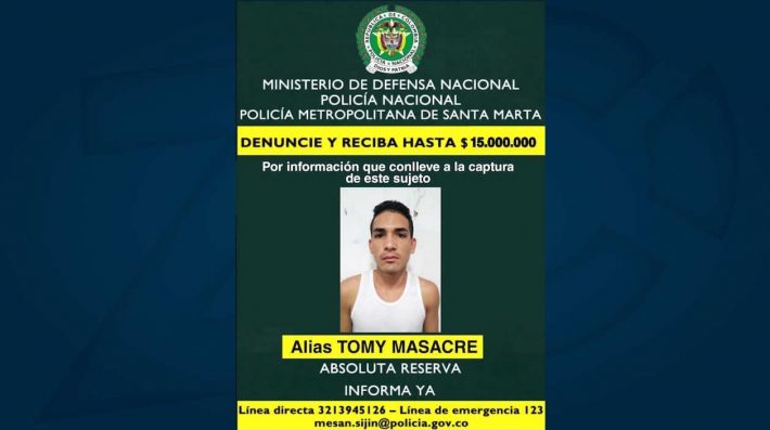 Policía de Santa Marta ofrece $15 millones de recompensa por alias ‘Tommy Masacre’